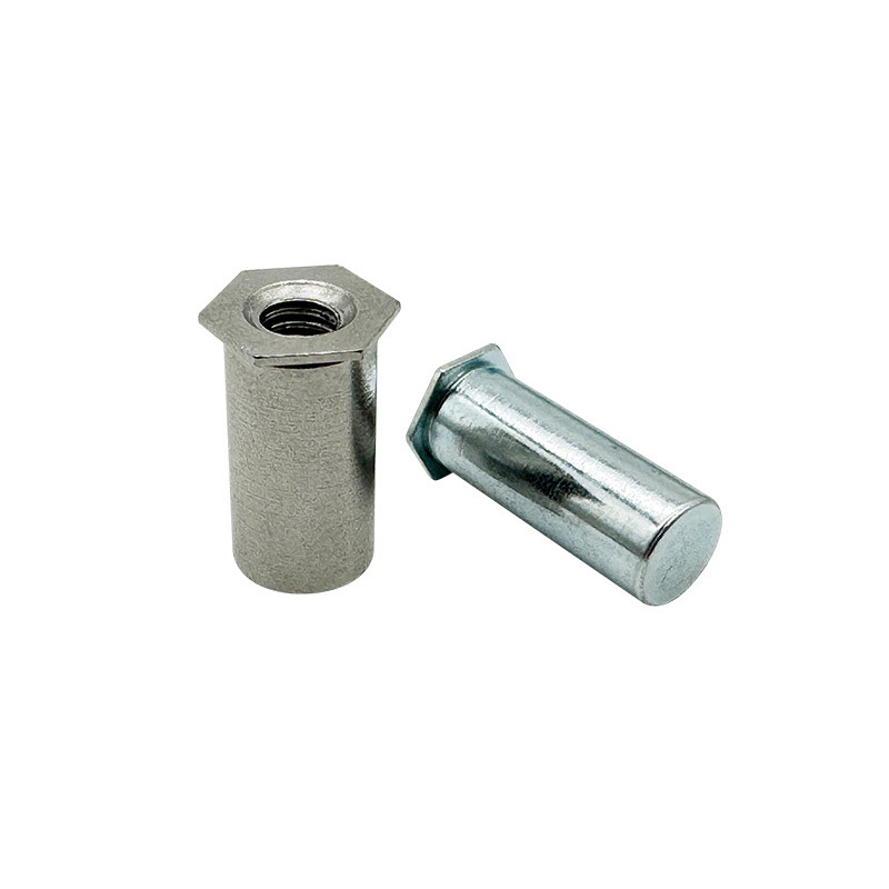 Para instalar la columna de tuerca de remache hexagonal de acero al carbono, usa una herramienta de tuerca remachada. El cuerpo hexagonal evita que gire cuando lo pones en un agujero predejado. La herramienta tira de la cabeza del mandril, haciendo que la columna de la manga se dobla contra la parte posterior de la pieza de trabajo. Eso crea un punto de anclaje roscado sólido y permanente. Hacer coincidir el tamaño del orificio con el diámetro de la columna de la tuerca del remache es muy importante aquí, hazte mal y no funcionará bien.