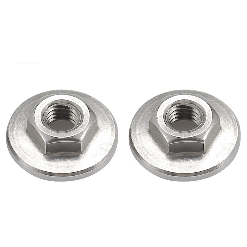 La parte más distintiva de esta tuerca es la brida incorporada: es un anillo plano más ancho conectado al cuerpo principal de la tuerca. La brida actúa como una arandela incorporada, por lo que no es necesario agregar una por separado. El cuerpo principal es cilíndrico, con roscas internas estándar que coinciden con pernos métricos o imperiales.