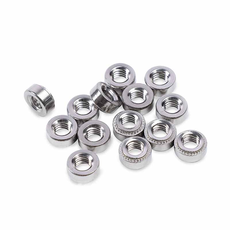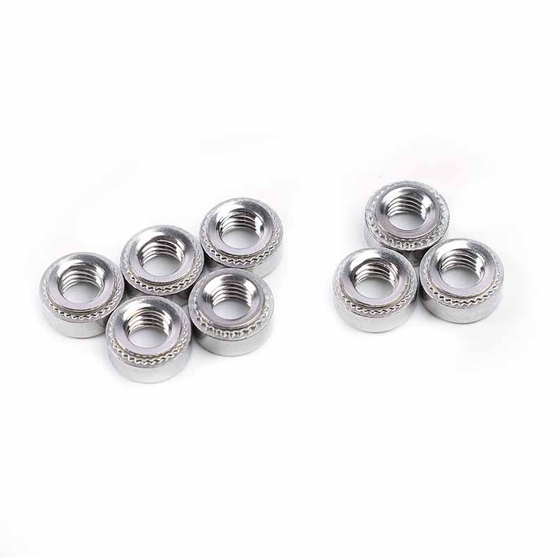 La nuez de microfirchamiento de rosca uniforme es mucho más pequeña que las nueces remachadas regulares. Los tamaños de hilo comunes son de M2 a M5, con pequeños mandril y diámetros corporales para que coincidan. Las especificaciones importantes incluyen el rango de agarre (cuán gruesos pueden ser los materiales que supliquen), estilos de cabeza (generalmente cúpula de contraunk o de bajo perfil) y la altura total cuando se instala.